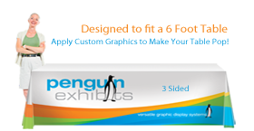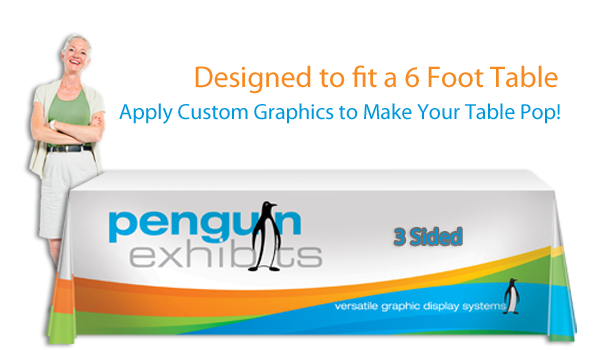 Maximize visual impact at your trade show booth, exhibition or in-store display table with a table throw. Sized to fit a standard 6ft table, the 3-Sided throw provides full length front and sides with a shorter back allowing for easy access to items stored underneath. Table throws are constructed of printed dyesublimation fabric.