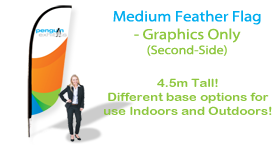 This product is graphics for the Medium Feather Flag second side (see product pe-medff). This must be purchased with product pe-medffg. This product is constructed with fibreglass poles with aluminum components and steel feet, and tension fabric dyesublimation graphics.