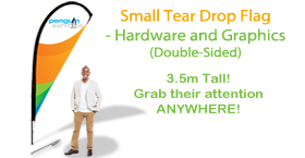 The Small Tear Drop Flag is 3.5 meters in height and can be purchased separately as hardware (pe-smtdf) or single-sided graphics (see product pe-smtdfg) or double-sided graphics (see product pe-smtdfg2).