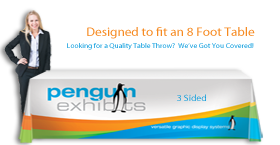 Maximize visual impact at your trade show booth, exhibition or in-store display table with a table throw. Sized to fit a standard 8ft table the 3-Sided throw provides full length front and sides with a shorter back allowing for easy access to items stored underneath. Table throws are constructed of printed dyesublimation fabric.