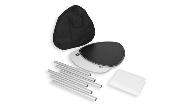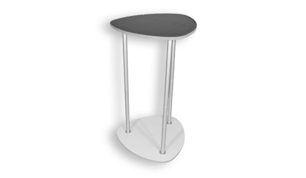 The Triangle Sock Box fabric counter is a sleek, simple and compact design that is ideal for exhibition use or store-front reception. The pole support panel stretches the fabric screen and connects the upper and lower panels to form the counter complete with an attractive black countertop. This lightweight product weighs no more than 24 lbs (40"h X 24"w). This product is constructed with an aluminum frame, wooden tops and bases and tensioned fabric dyesublimation graphics.
