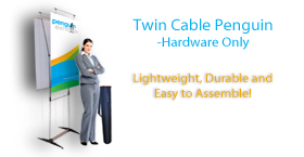 Our Standard Twin Cable Penguin is perfect for trade shows, exhibitions, store openings, specials or any event that needs a bold statement. The Standard Twin Cable Penguin is 86.25” high and is available in 4 widths from 27.5" to 39.4". Each unit includes a convenient, compact transport case.